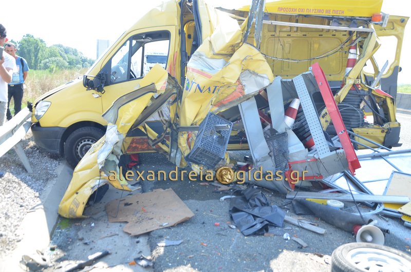Από την σύγκρουση τραυματίστηκε ο οδηγός του Ι.Χ. αυτοκινήτου που προφανώς σταμάτησε να αλλάξει λάστιχο και μεταφέρθηκε με ασθενοφόρο στο Νοσοκομείο της Βέροιας. Ο οδηγός του από το φορτηγάκι και η ομάδα της Εγνατίας Οδού δεν τραυματίστηκαν.