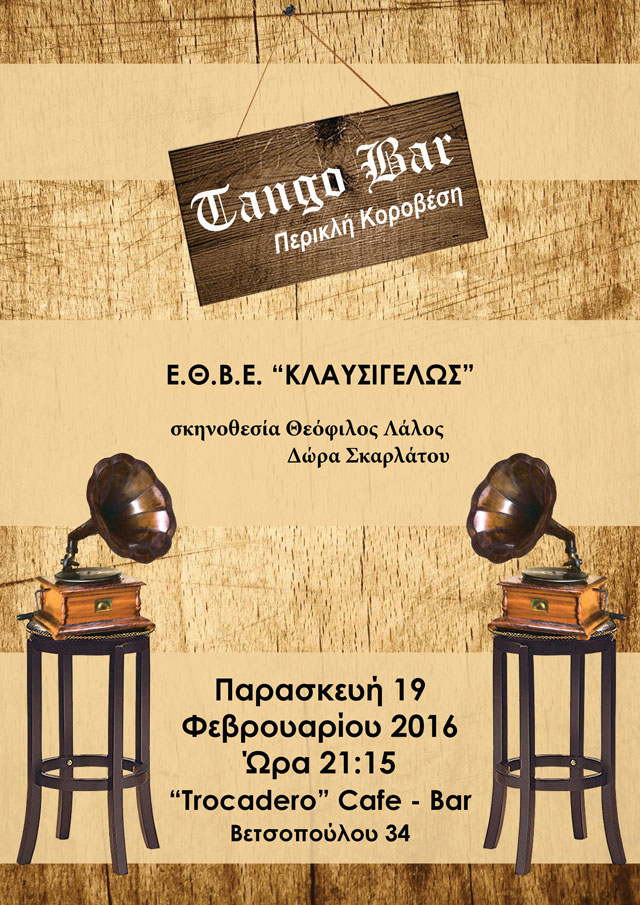 Οι Παλαίμαχοι λοιπόν φέρνουν την Παρασκευή 19 Φεβρουαρίου την θεατρική παράσταση “Tango Bar” του Περικλή Κοροβέση από τους “Ε.Θ.Β.Ε. “Κλαυσίγελως”.