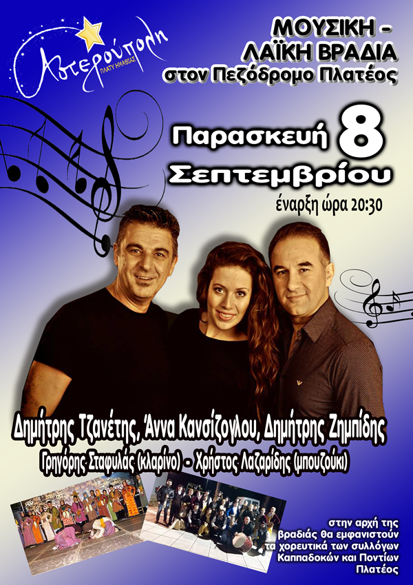 Ο Πολιτιστικός Σύλλογος Δ.Δ. Πλατέος «Η Αστερούπολη» σας προσκαλεί στη μουσική – λαϊκή βραδιά που διοργανώνει, επί τη ευκαιρία του πανηγυριού του χωριού, στον πεζόδρομο Πλατέος την Παρασκευή 8 Σεπτεμβρίου 2017.