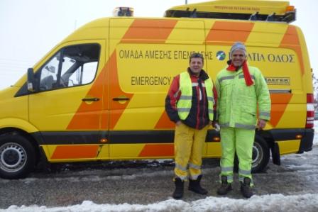 Μαζί με τα εκχιονιστικά μηχανήματα σήμερα το μεσημέρι συναντήσαμε στον κόμβο Νησελίου την ομάδα άμεσης επέμβασης της Εγνατίας οδού που επέβλεπε την εξέλιξη της πορείας των αυτοκινήτων. Όπως μας είπαν ήταν σε ετοιμότητα διαρκώς για επέμβουν σε οποιαδήποτε ανάγκη.
