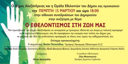 Στην ημερίδα θα μιλήσουν η Ολυμπιονίκης Βούλα Πατουλίδου, ο Αρχιμανδρίτης Διονύσιος Ανθόπουλος Αρχιερατικός Επίτροπος Αλεξάνδρειας και ο συντονιστής της Ομάδας Διαχείρισης Κρίσεων (ΟΔΙΚ) Κωνσταντίνος Φεζούδης, ενώ η πρόεδρος του δημοτικού συμβουλίου και υπεύθυνη εθελοντισμού του δήμου Αλεξάνδρειας Όλγα Μοσχοπούλου θα παρουσιάσει το γενικό πλαίσιο σχεδιασμού των δράσεων εθελοντισμού του δήμου. Σημειώνεται ότι, με απόφαση του δημοτικού συμβουλίου, ιδρύθηκε και ξεκίνησε ήδη τη λειτουργία του Γραφείο Εθελοντισμού στο δήμο Αλεξάνδρειας, με σκοπούς: