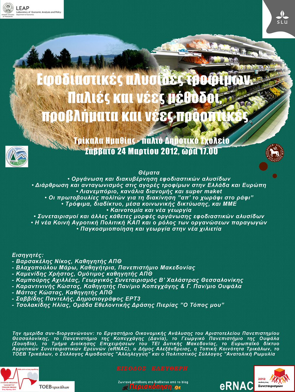 Με αφορμή τις πρόσφατες πρωτοβουλίες διακίνησης γεωργικών προϊόντων μέσω φορέων κοινωνικής δικτύωσης με την χρήση του διαδικτύου, το Σάββατο 24 Μαρτίου διοργανώνεται στα Τρίκαλα Ημαθίας μία πολύ ενδιαφέρουσα ημερίδα με θέμα “Εφοδιαστικές αλυσίδες τροφίμων. Είναι μία συζήτηση που αξίζει να παρακολουθήσουμε όλοι μας. Η ημερίδα θα γίνει στο παλιό δημοτικό σχολείο από τις 5 μέχρι τις 8 το βράδυ με ελεύθερη είσοδο. Διαβάστε λεπτομέρειες: