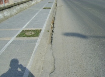 Στο μέσο του μήκους της (προς την πλευρά του Λυκείου) και παράλληλα με το κράσπεδο χάσκει ένα αυλάκι μήκους περίπου 80 μέτρων και πλάτους και βάθους 15 περίπου εκατοστών, (βλέπε φωτο) το οποίο είναι επικίνδυνο για ποδηλάτες αλλά και αυτοκίνητα, αλλά και δεν γίνεται η παροχέτευση των νερών της βροχής, αφού οι σχάρες των φρεατίων είναι ψηλότερες. Σκέφθηκα ότι δεν θα έφτασε μάλλον το τσιμέντο για να κλείσει το αυλάκι.