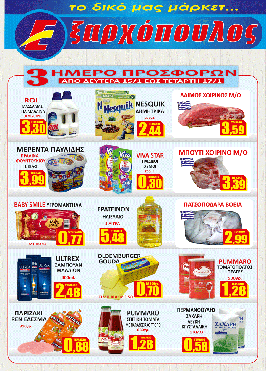 Το τοπικό σούπερ μάρκετ ΕΞΑΡΧΟΠΟΥΛΟΣ από σήμερα Δευτέρα 15 Ιανουαρίου μέχρι και την Τετάρτη 17 Ιανουαρίου προσθέτει 15 νέα έκτακτα προϊόντα στις προσφορές του καταστήματος!