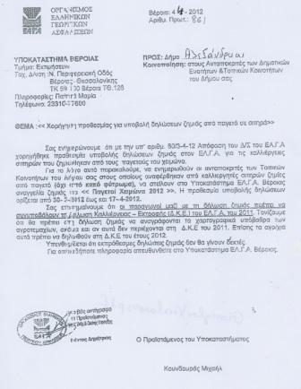 Από το Υποκατάστημα Βέροιας του ΕΛ.Γ.Α. έγινε γνωστό ότι, με την αριθ. 60/3-4-2012 απόφαση του Δ.Σ. του ΕΛ.Γ.Α., χορηγήθηκε προθεσμία υποβολής δηλώσεων ζημιάς για τις καλλιέργειες σιτηρών που ζημιώθηκαν από τους παγετούς του χειμώνα.