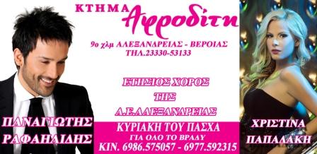 Την Κυριακή του Πάσχα η ομάδα της Αλεξάνδρειας διοργανώνει τον ετήσιο χορό της στο Κτήμα Αφροδίτη. H ώρα προσέλευσης είναι 22:00 και το πρόγραμμα για όλο το βράδυ θα καλύψουν ο Παναγιώτης Ραφαηλίδης και η Χριστίνα Παπαδάκη.