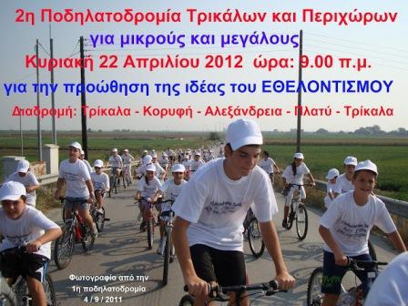 Για την καλύτερη και αρτιότερη οργάνωση της 2ης ποδηλατοδρομίας, καλούνται όσοι επιθυμούν να πάρουν μέρος, να το δηλώσουν μέχρι την Τετάρτη 18 Απριλίου, στα γραφεία του Συλλόγου (καθημερινά 09.00 – 12.00) και στο Κοινοτικό Κατάστημα Τρικάλων τηλ: 23330 81204
