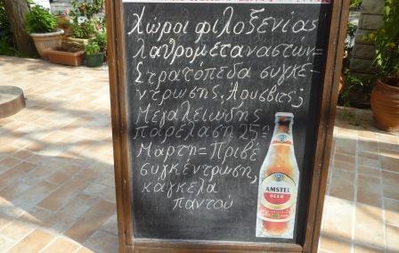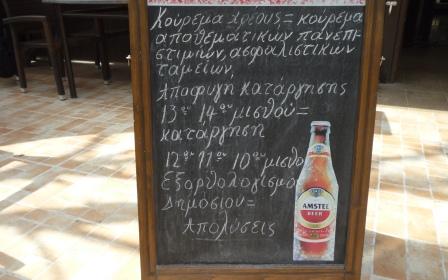 Στην ψαροταβέρνα του Νίκου Καραγιαννίδη είδαμε δύο εικόνες οι οποίες μας άρεσαν. Πρόκειται για δύο επίκαιρες ταμπέλες φράσεων οι οποίες αναφέρονται στα στρατόπεδα λαθρομεταναστών, στο κούρεμα του χρέους και στους μισθούς και σε πολλά ακόμα με αστείο και διασκεδαστικό τρόπο. Δείτε και την άλλη εικόνα:
