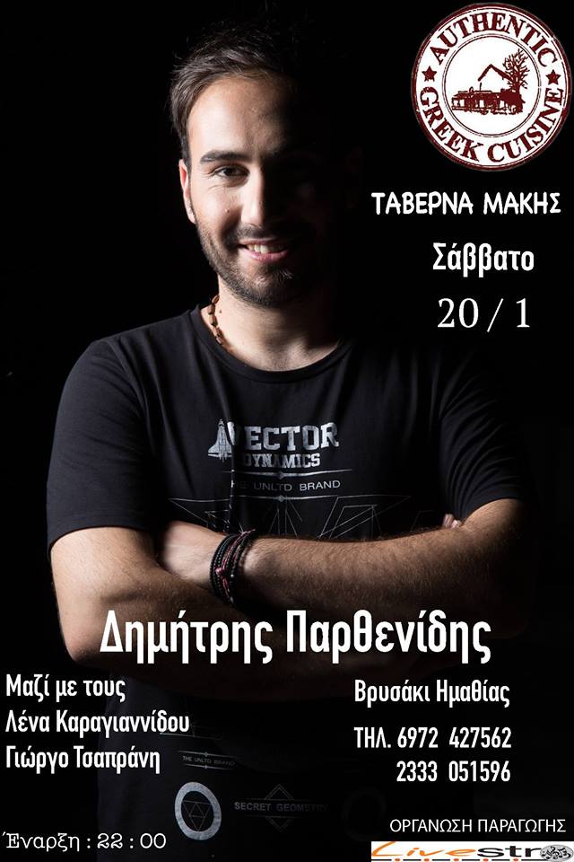 Για πρώτη φορά το ερχόμενη Σάββατο η μουσική σκηνή της ταβέρνας ΜΑΚΗΣ στο Βρυσάκη θα υποδεχτεί τον Δημήτρη Παρθενίδη με τα έντεχνα ακούσματά του!