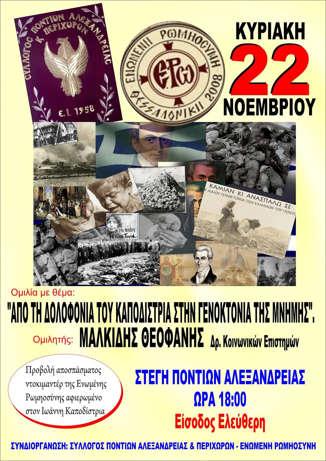 Ο Σύλλογος Ποντίων Αλεξάνδρειας και περιχώρων διοργανώνει την Κυριακή 22 Νοεμβρίου στη στέγη του ομιλία με θέμα: “Από τη δολοφονία του Καποδίστρια στην γενοκτονία της μνήμης”.