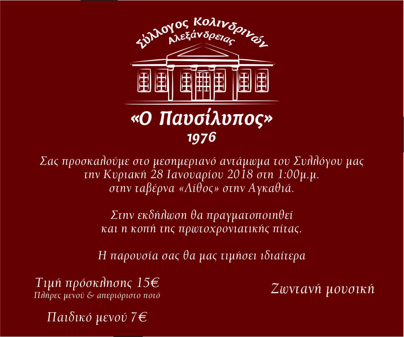 Μεσημεριανό αντάμωμα διοργανώνει ο Σύλλογος Κολινδρινών Αλεξάνδρειας “Ο Παυσίλυπος” την Κυριακή 28 Ιανουαρίου στη 1 το μεσημέρι στην ταβέρνα “Λίθος” στην Αγκαθιά.