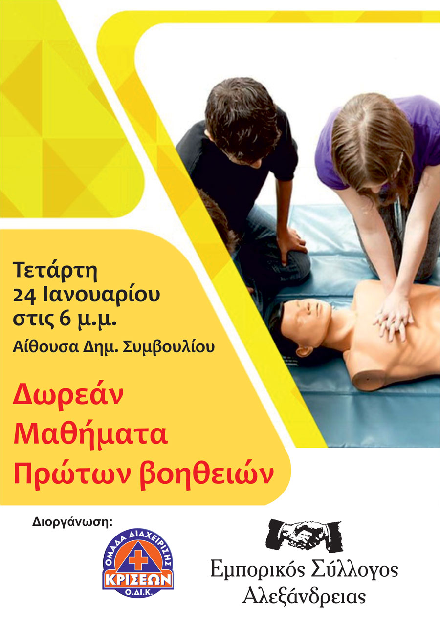 Το Διοικητικό Συμβούλιο του Εμπορικού Συλλόγου Αλεξάνδρειας, σας προσκαλεί  στο σεμινάριο που διοργανώνει σε συνεργασία με την ΟΜΑΔΑ Ο.ΔΙ.Κ (Ομάδα διαχείρισης κρίσεων), την Τετάρτη  24  Ιανουαρίου  2018 και ώρα 18:00 στην αίθουσα Δημοτικού Συμβουλίου του Δήμου Αλεξάνδρειας, με θέμα: ΄΄ΔΩΡΕΑΝ ΜΑΘΗΜΑΤΑ ΠΡΩΤΩΝ ΒΟΗΘΕΙΩΝ΄΄.