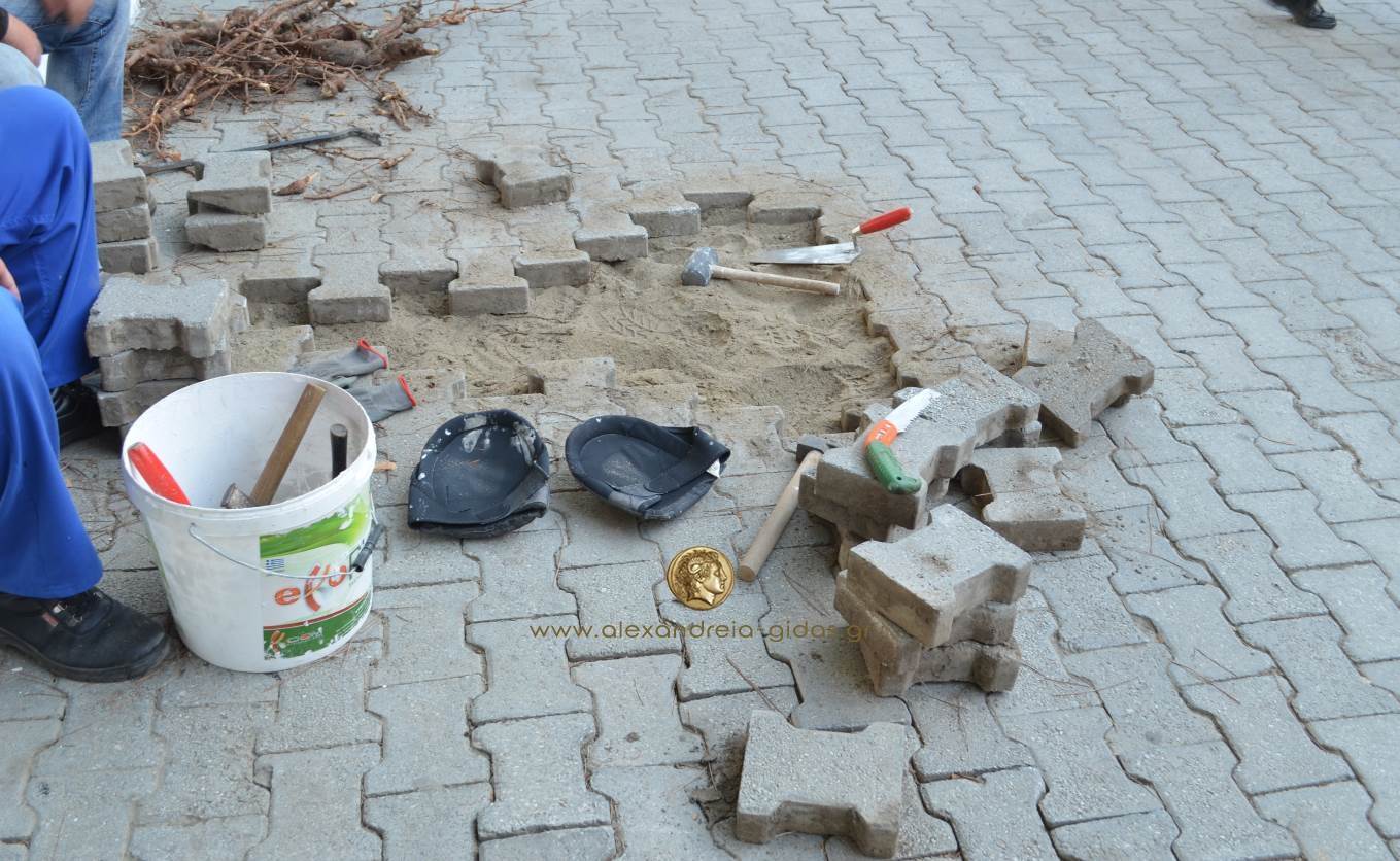 Συνεργεία και υπάλληλοι του δήμου Αλεξάνδρειας βρίσκονται στον πεζόδρομο της Εθνικής Αντίστασης και διορθώνουν τα παγκάκια ενώ διορθώνεται και το έδαφος του πεζόδρομου σε σημεία που χρειάζεται.