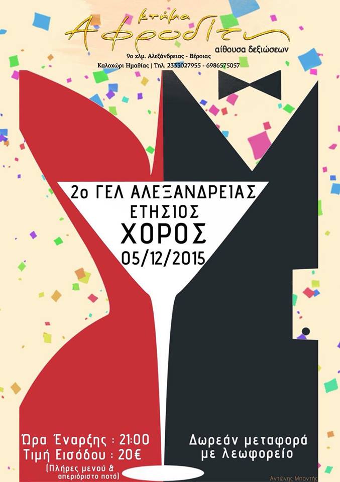 1o1Οι μαθητές και οι μαθήτριες της Γ΄ τάξης του 2ου Γενικού Λυκείου Αλεξάνδρειας σας προσκαλούν στον ετήσιο χορό που διοργανώνουν το Σάββατο 5 Δεκεμβρίου.