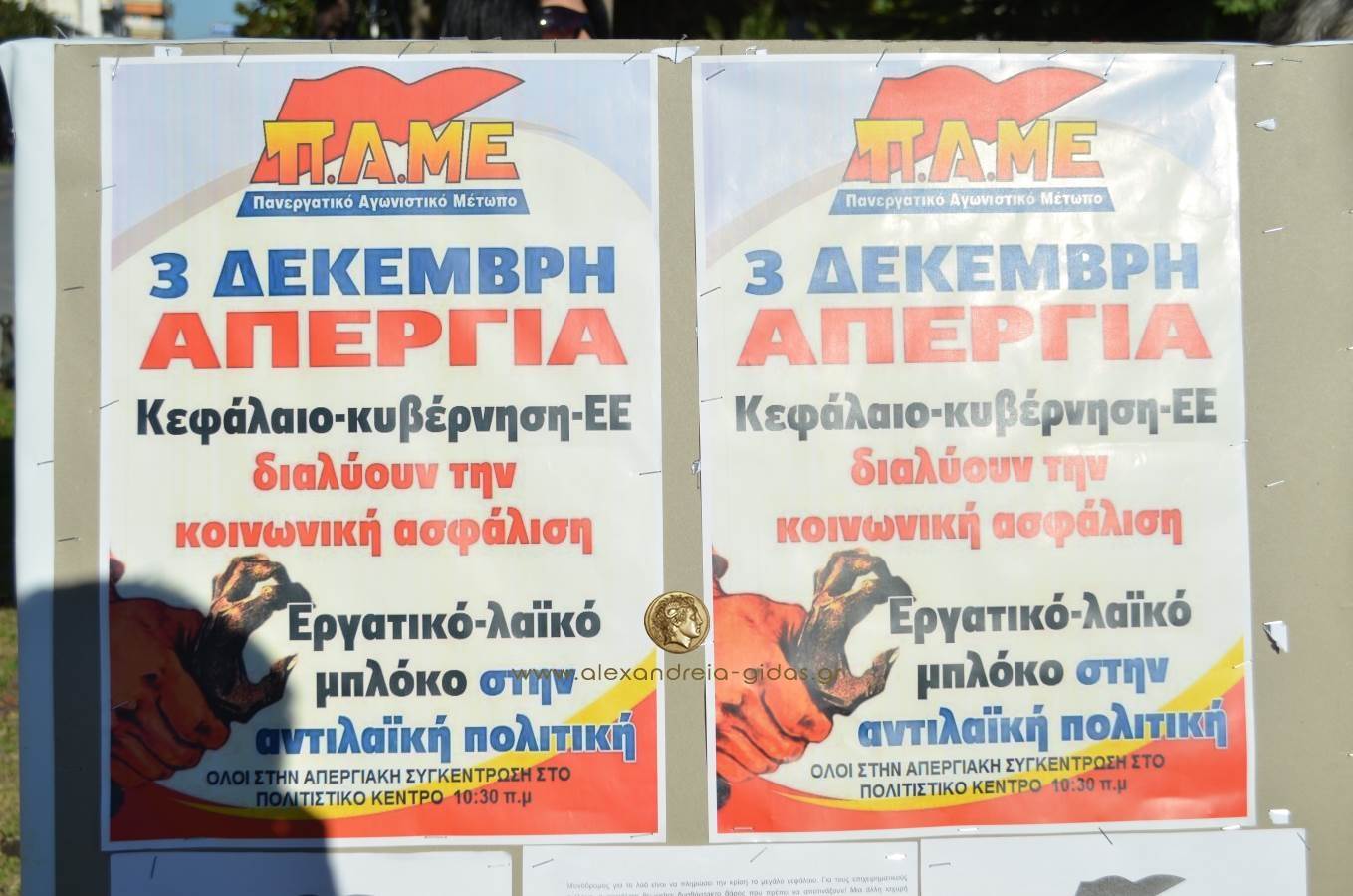 Απεργιακή συγκέντρωση πραγματοποίησε σήμερα Πέμπτη 3 Δεκεμβρίου το ΠΑΜΕ στην Αλεξάνδρεια μπροστά στο Πνευματικό Κέντρο.
