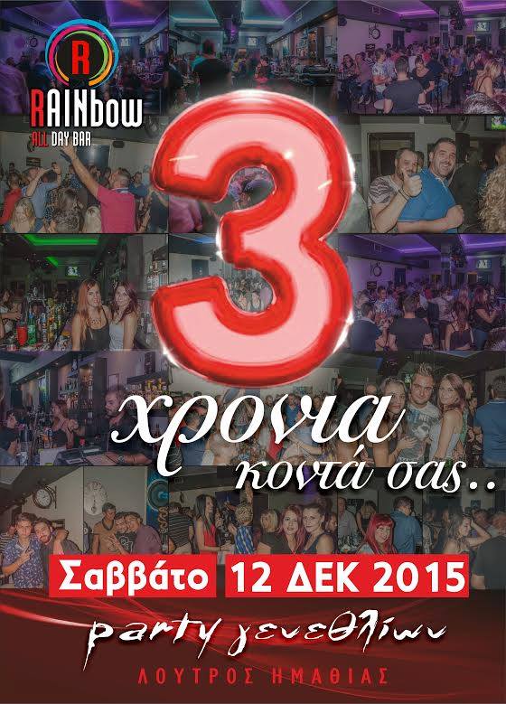 RAINBOW1-600x340Τρία χρόνια λειτουργίας κλείνει το Σάββατο 12 Δεκεμβρίου το All Day Bar RAINBOW στον Λουτρό!