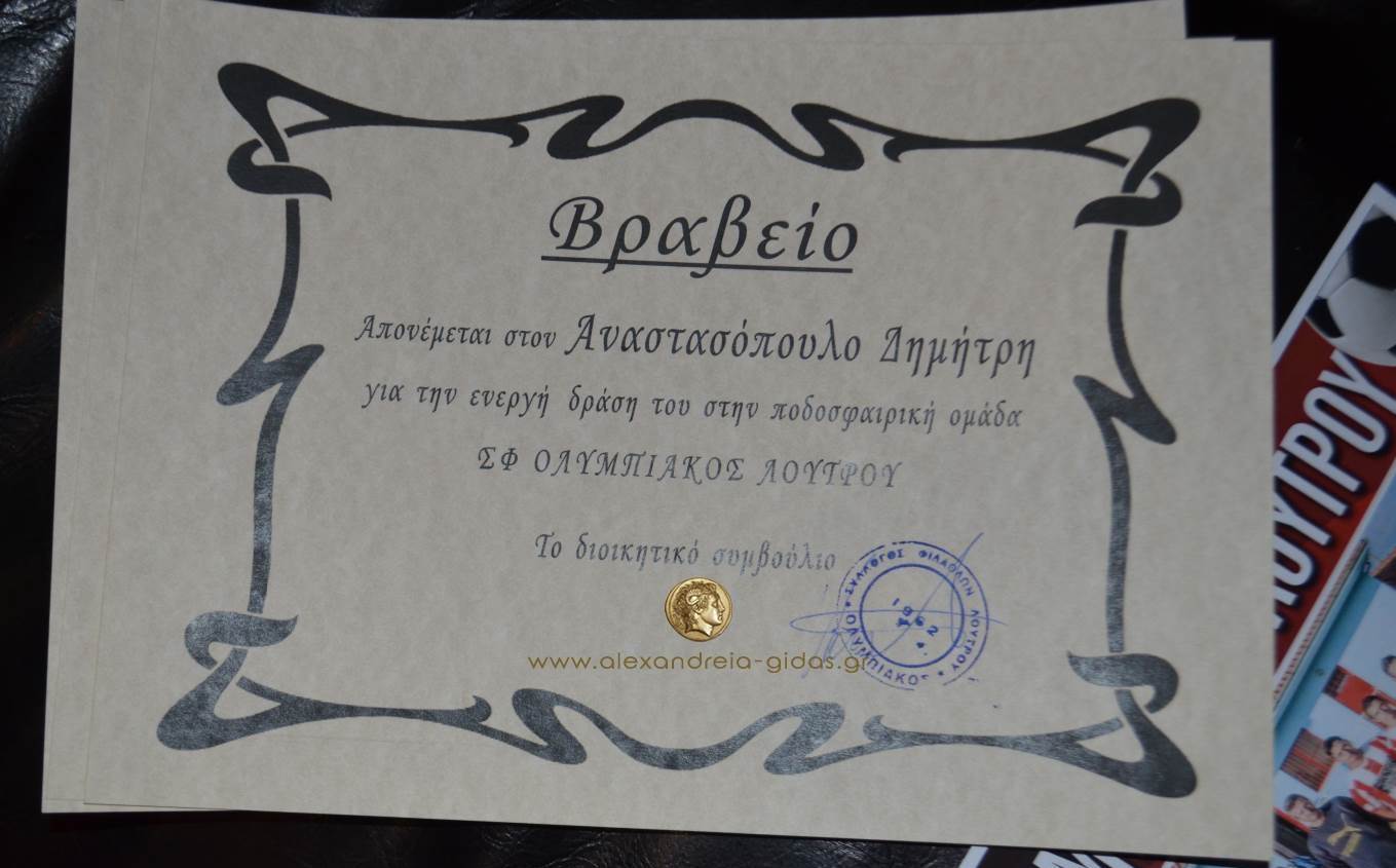 - Νίκος Αναστασόπουλος, νυν προπονητής του Ολυμπιακού Λουτρού για την προσφορά του στο ποδόσφαριο και για την καριέρα του