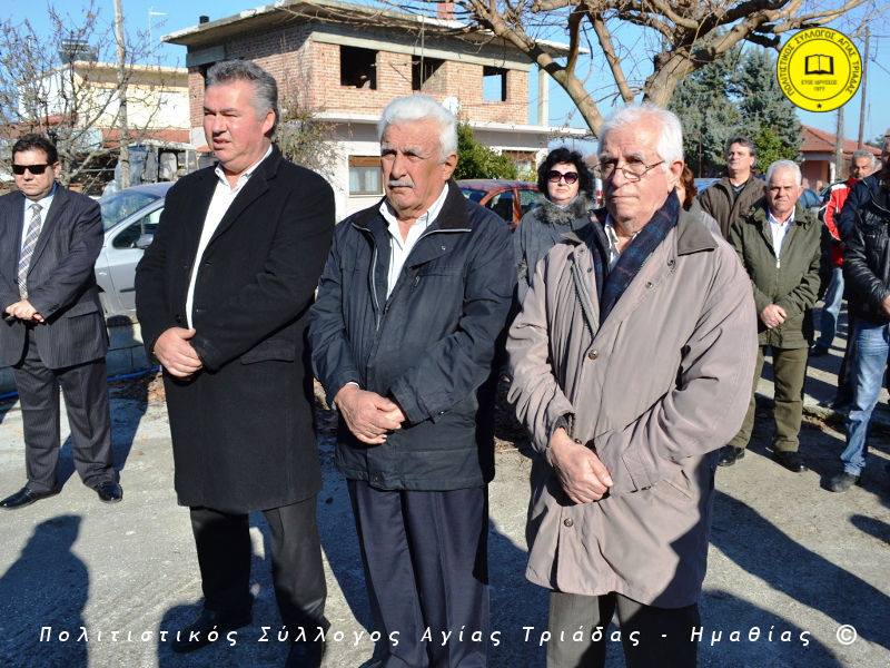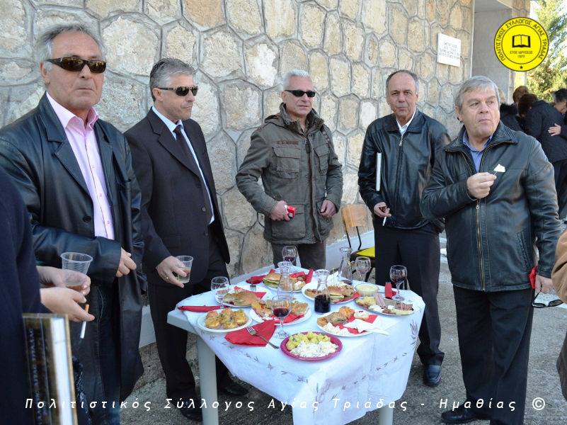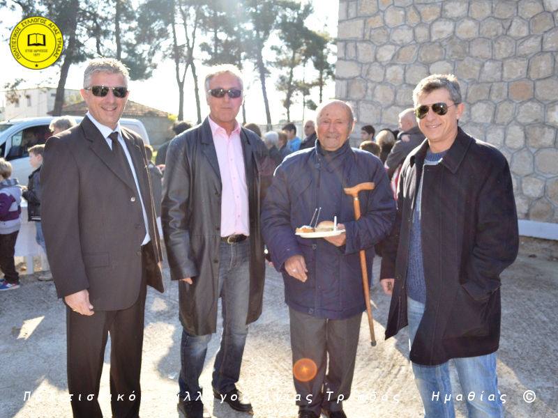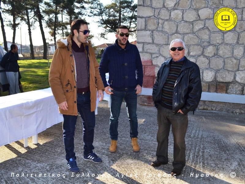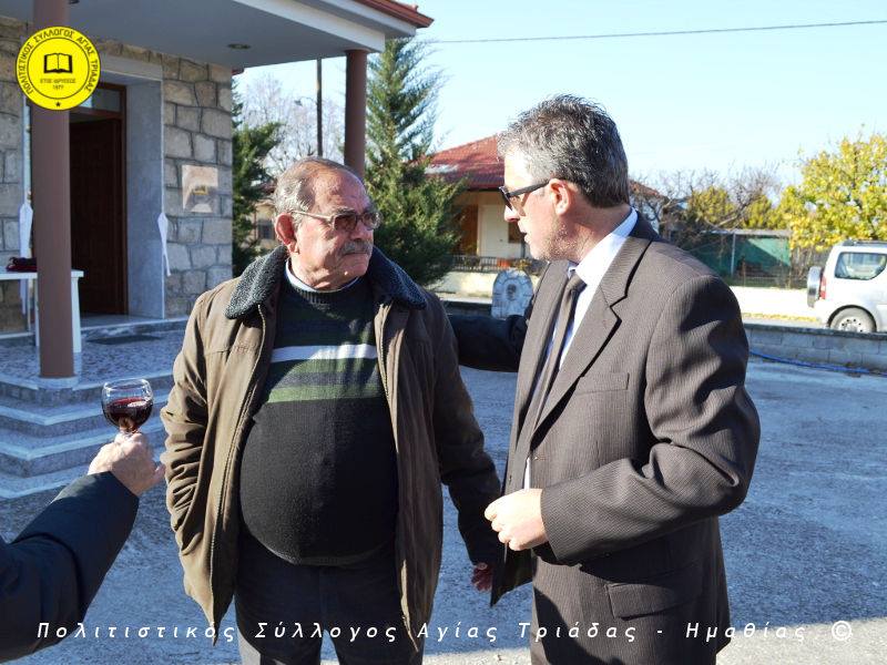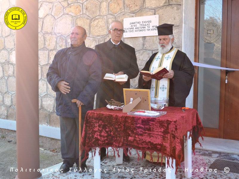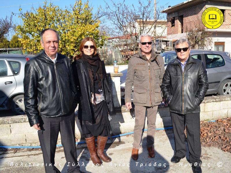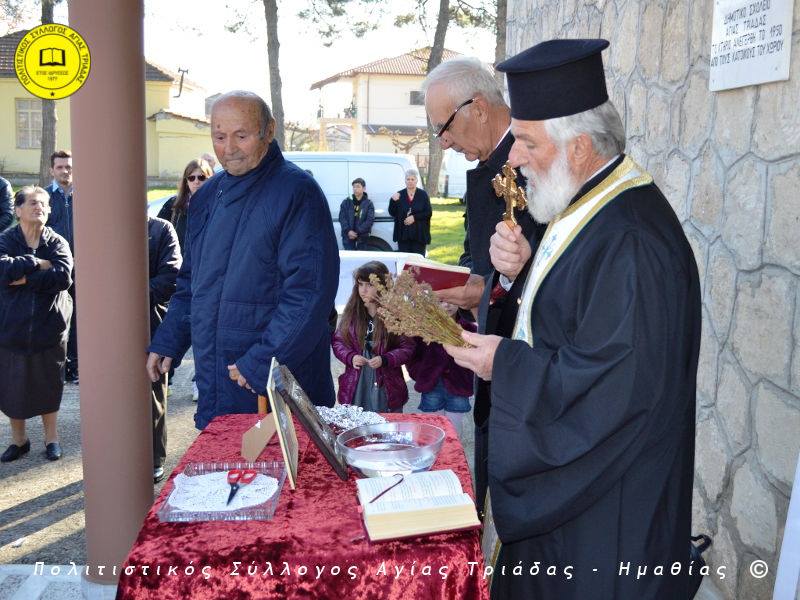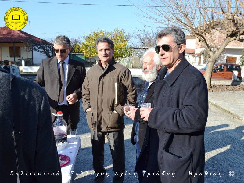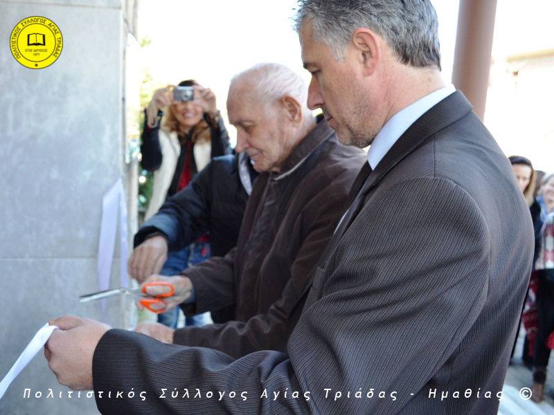 Ο γηραιότερος κάτοικος της Αγίας Τριάδας κ. Γιώργος Σισμανίδης και πρόεδρος του Πολιτιστικού Συλλόγου Αγίας Τριάδας Γιώργος Μπλαχάβας έκοψαν την κορδέλα παρουσία πλήθους κόσμου. Ανάμεσα στους παρευρισκόμενους ο βουλευτής του ΣΥΡΙΖΑ Ημαθίας Χρήστος Αντωνίου και ο αντιδήμαρχος Μελίκης Νίκος Σαρακατσιάνος.
