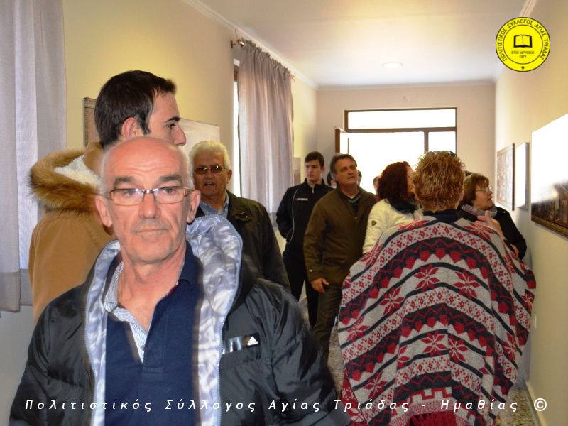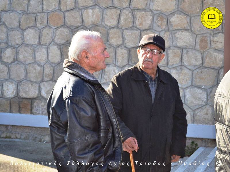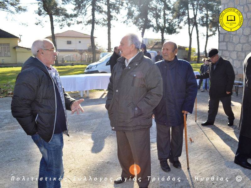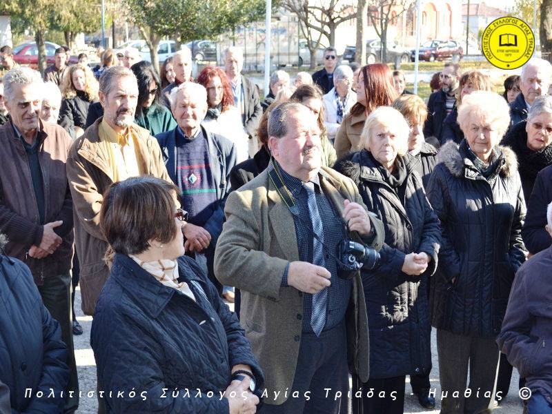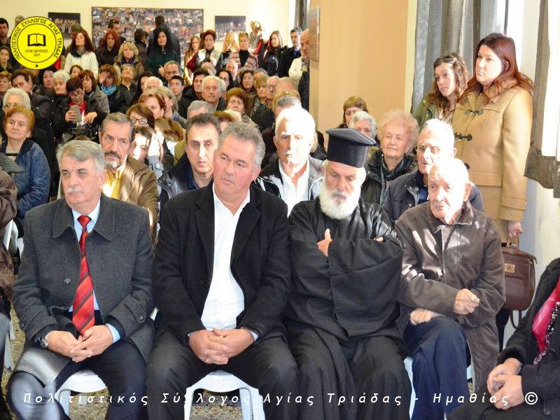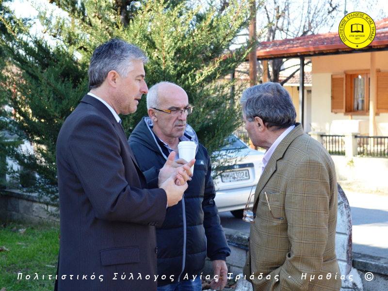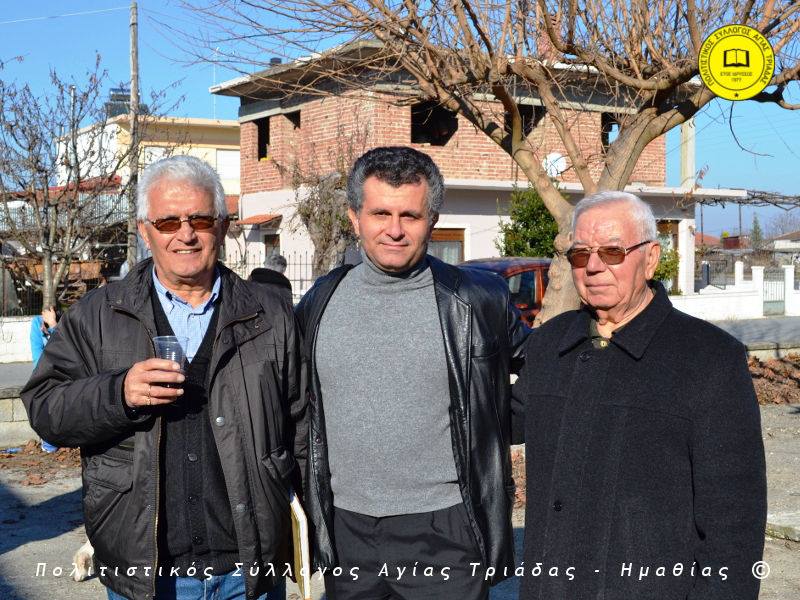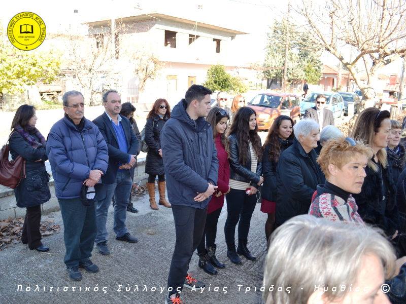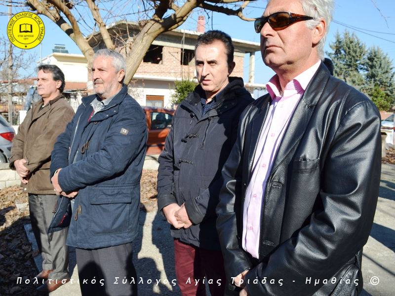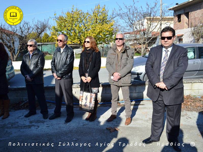 Ο γηραιότερος κάτοικος της Αγίας Τριάδας κ. Γιώργος Σισμανίδης και πρόεδρος του Πολιτιστικού Συλλόγου Αγίας Τριάδας Γιώργος Μπλαχάβας έκοψαν την κορδέλα παρουσία πλήθους κόσμου. Ανάμεσα στους παρευρισκόμενους ο βουλευτής του ΣΥΡΙΖΑ Ημαθίας Χρήστος Αντωνίου και ο αντιδήμαρχος Μελίκης Νίκος Σαρακατσιάνος.