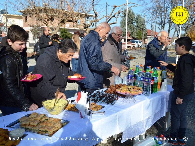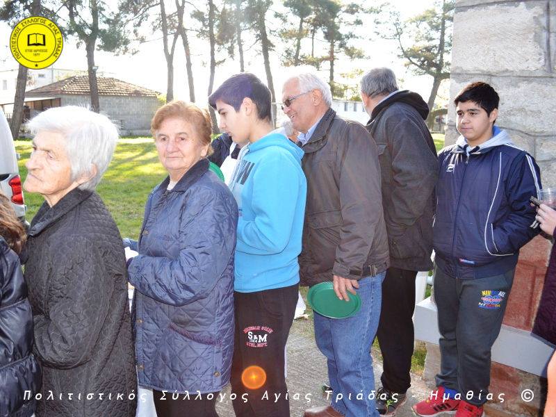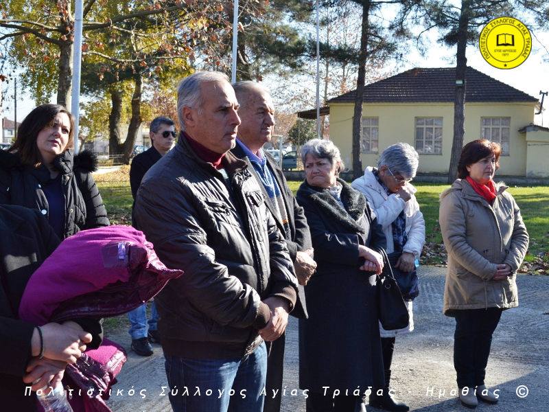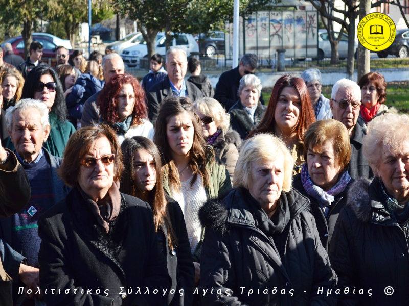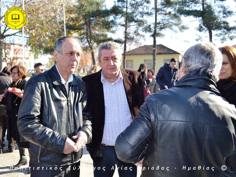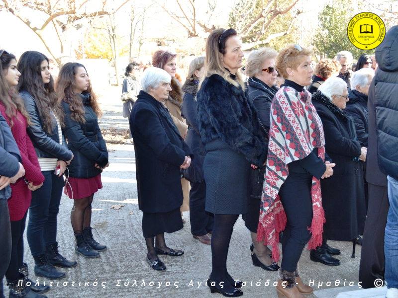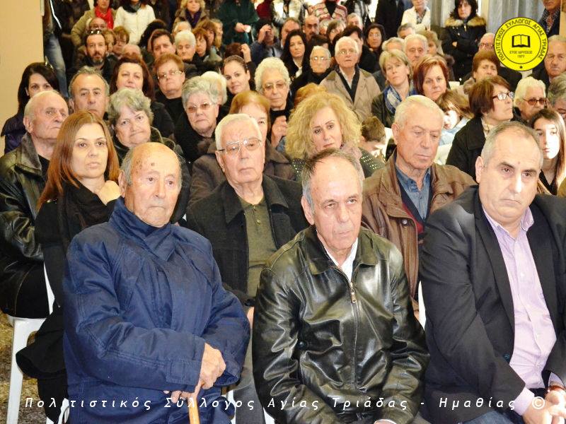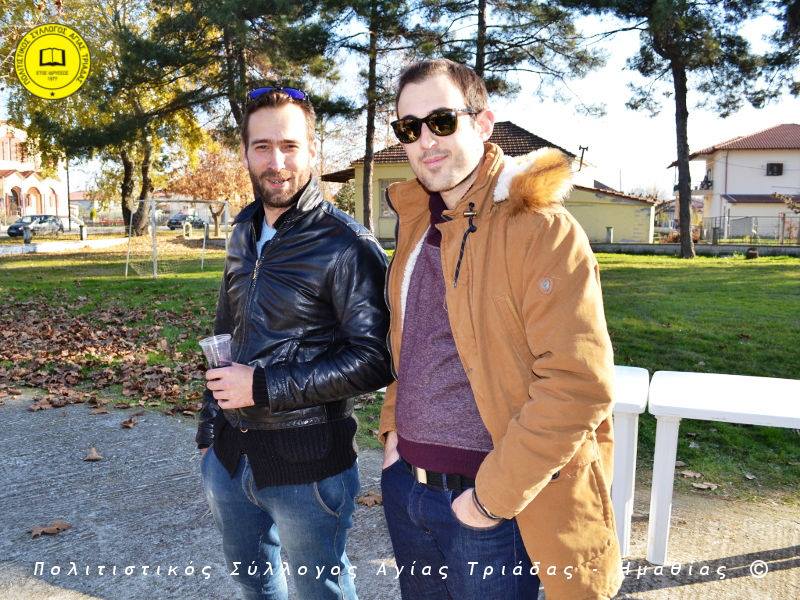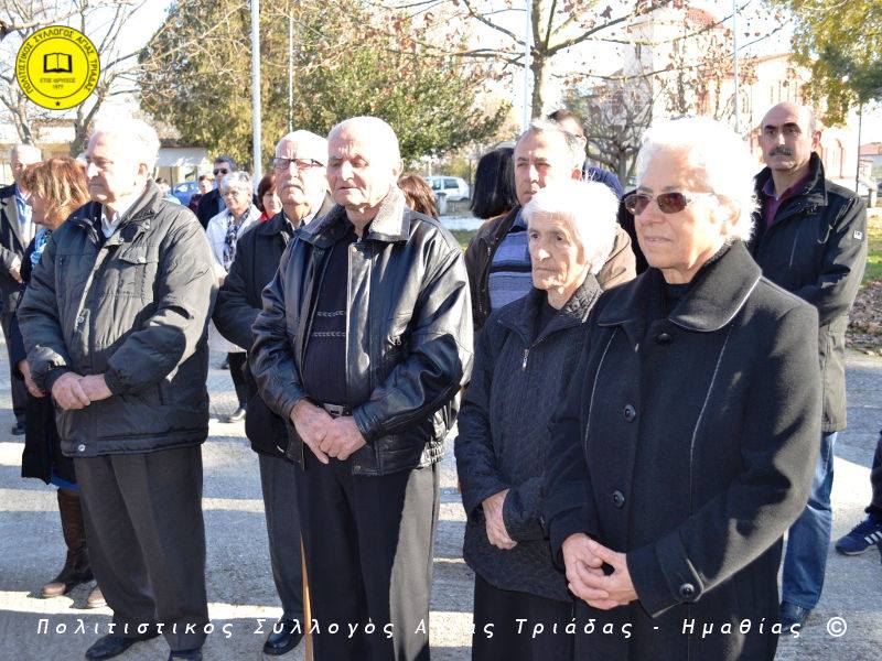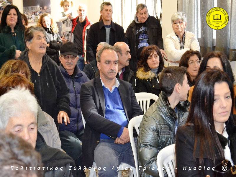 Ο γηραιότερος κάτοικος της Αγίας Τριάδας κ. Γιώργος Σισμανίδης και πρόεδρος του Πολιτιστικού Συλλόγου Αγίας Τριάδας Γιώργος Μπλαχάβας έκοψαν την κορδέλα παρουσία πλήθους κόσμου. Ανάμεσα στους παρευρισκόμενους ο βουλευτής του ΣΥΡΙΖΑ Ημαθίας Χρήστος Αντωνίου και ο αντιδήμαρχος Μελίκης Νίκος Σαρακατσιάνος.