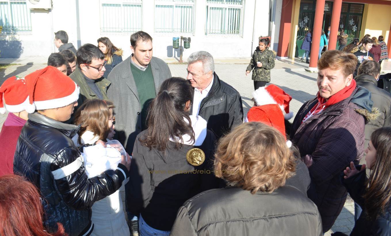 Στον χώρο του 1ου Γυμνασίου ευχήθηκε χρόνια πολλά στους μαθητές και καθηγητές του σχολείου καθώς και στους μαθητές και καθηγητές των Παιδιών της Άνοιξης που βρέθηκαν στο 1ο Γυμνάσιο της πόλης μας για την Χριστουγεννιάτικη γιορτή που διοργανώθηκε το πρωί.