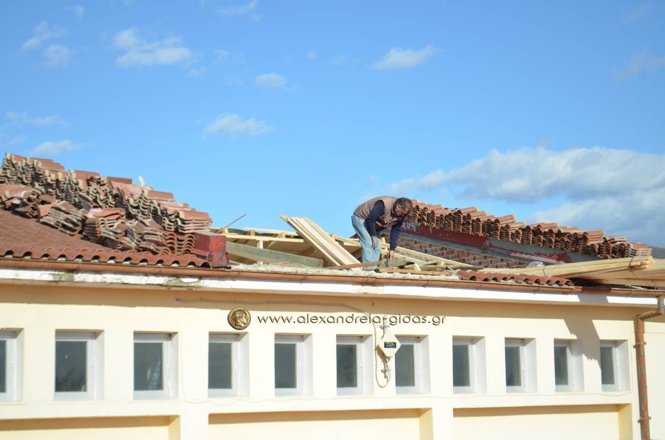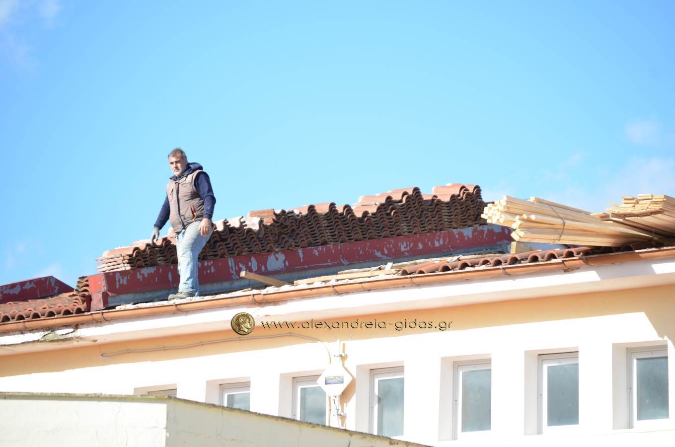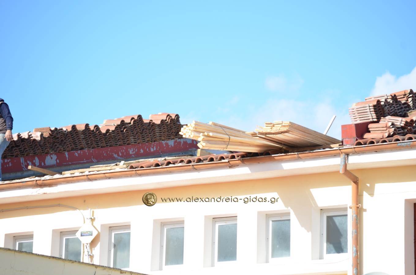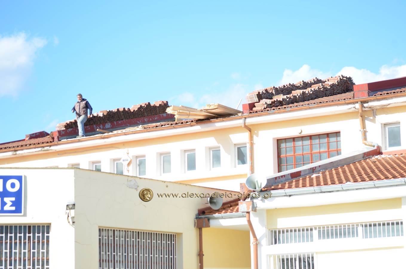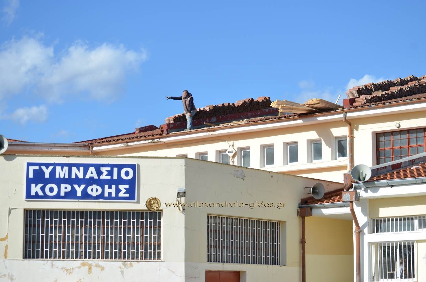 Ένα ανάλογο πρόβλημα πρόλαβαν οι υπεύθυνοι του Γυμνασίου Κορυφής και του δήμου Αλεξάνδρειας επιδιορθώνοντας τη σκεπή του σχολικού κτιρίου.