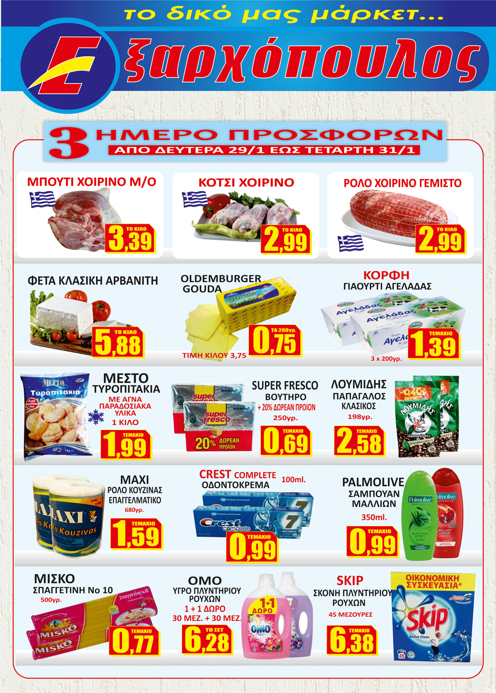 Το τοπικό σούπερ μάρκετ ΕΞΑΡΧΟΠΟΥΛΟΣ από τη Δευτέρα 29 Ιανουαρίου μέχρι και την Τετάρτη 31 Ιανουαρίου προσθέτει 15 νέα έκτακτα προϊόντα στις προσφορές του καταστήματος!
