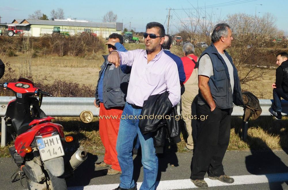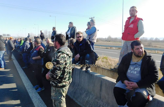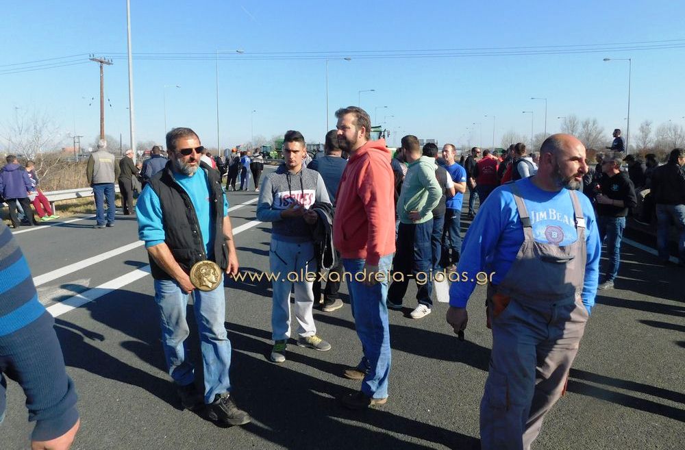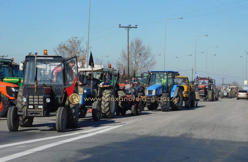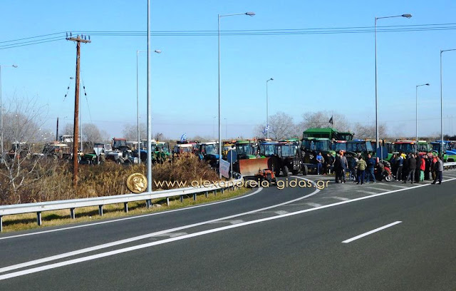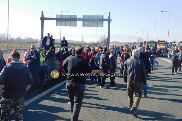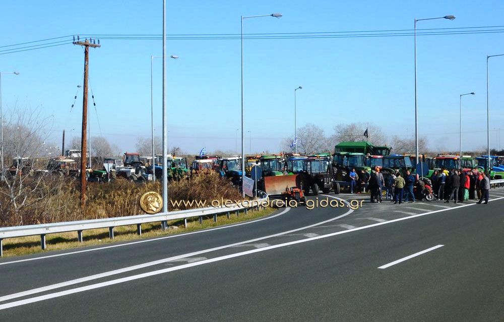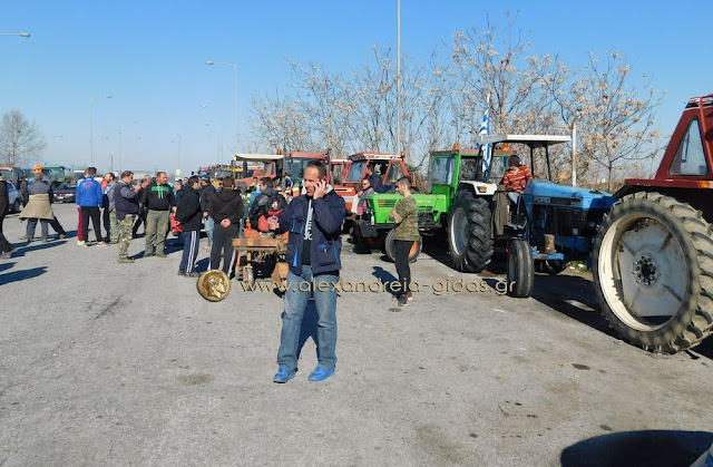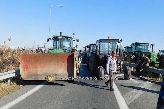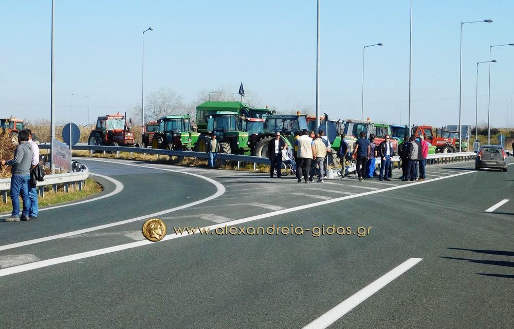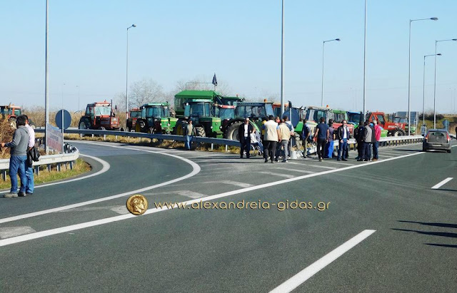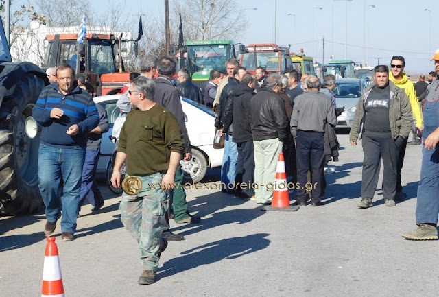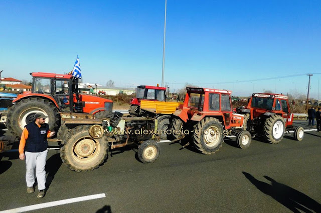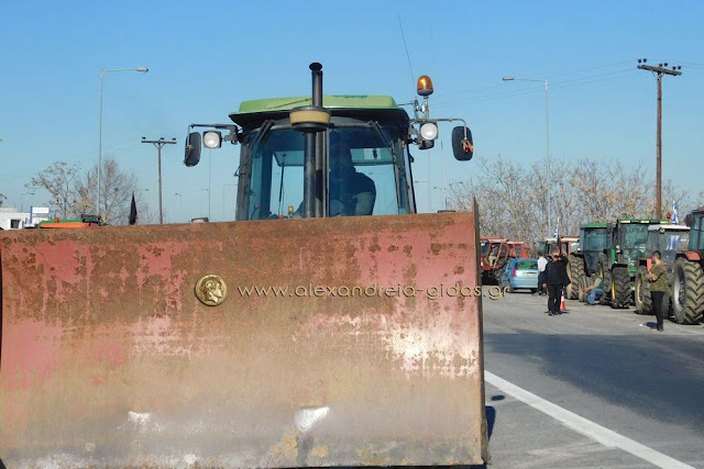 Τηρώντας την απόφαση που πήραν στη Γενική Συνέλευση της Κυριακής 31 Ιανουαρίου, οι αγρότες του δήμου Αλεξάνδρειας έβγαλαν το μεσημέρι της Δευτέρας 1 Φεβρουαρίου τα τρακτέρ του στην Εγνατία Οδό κλείνοντας επ΄ αόριστον το ρεύμα προς τη Βέροια από τον κόμβου του Νησελίου.