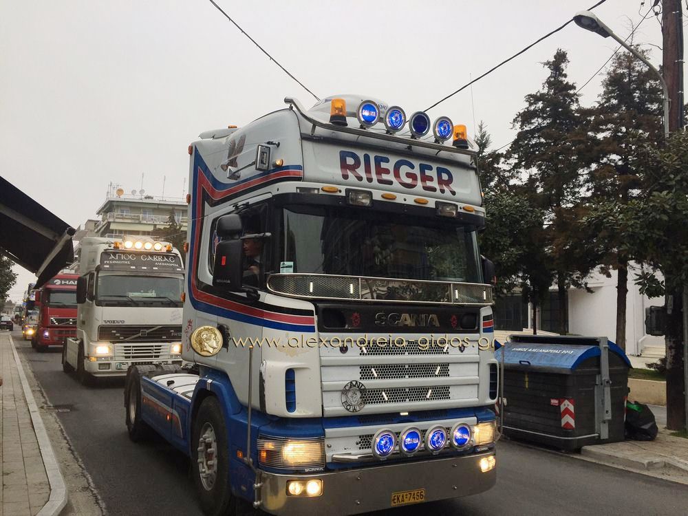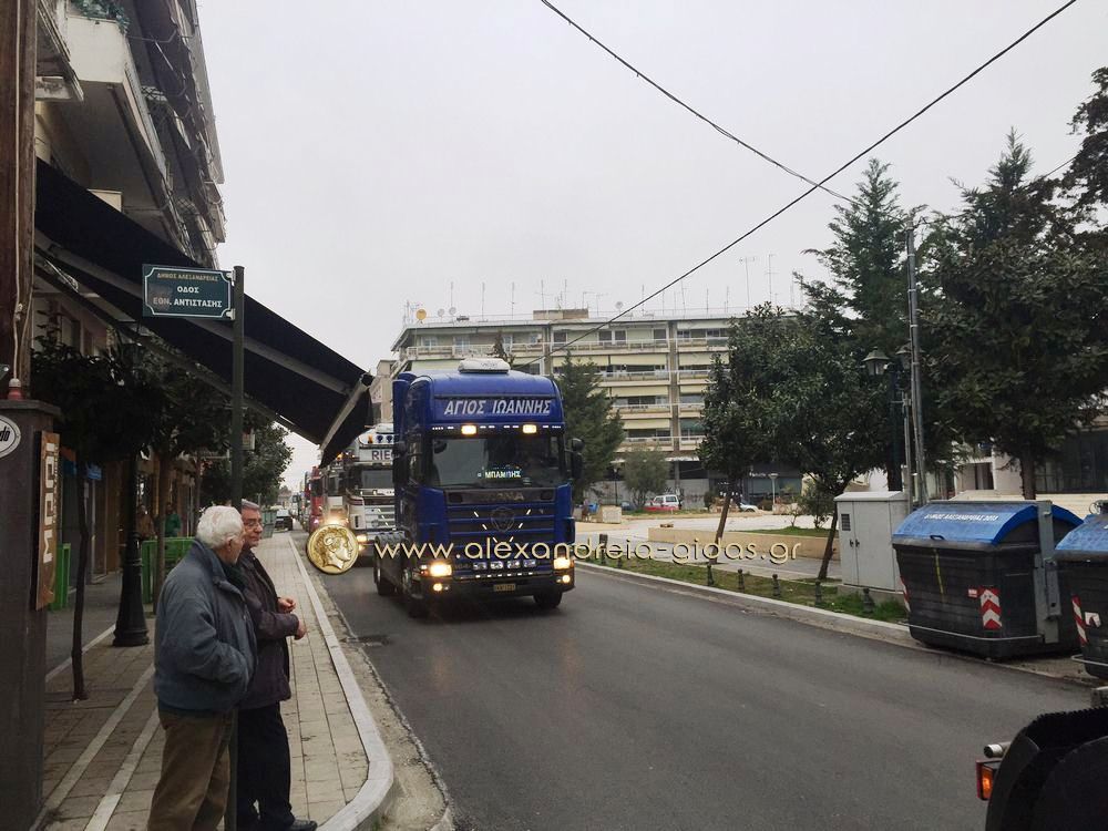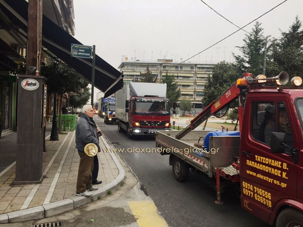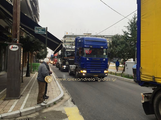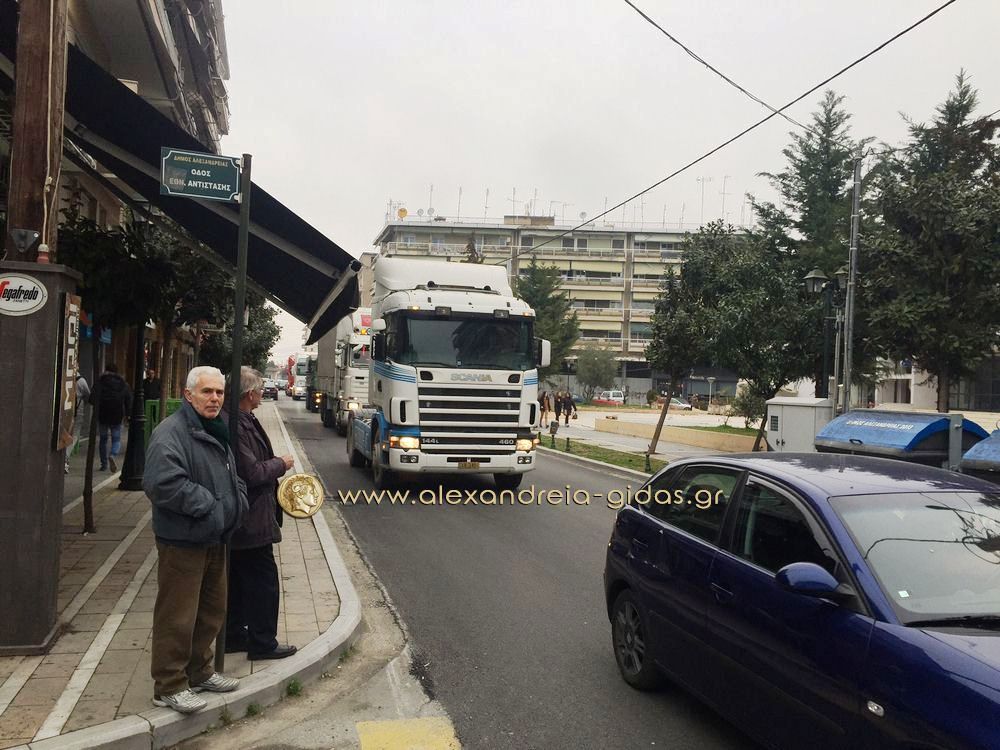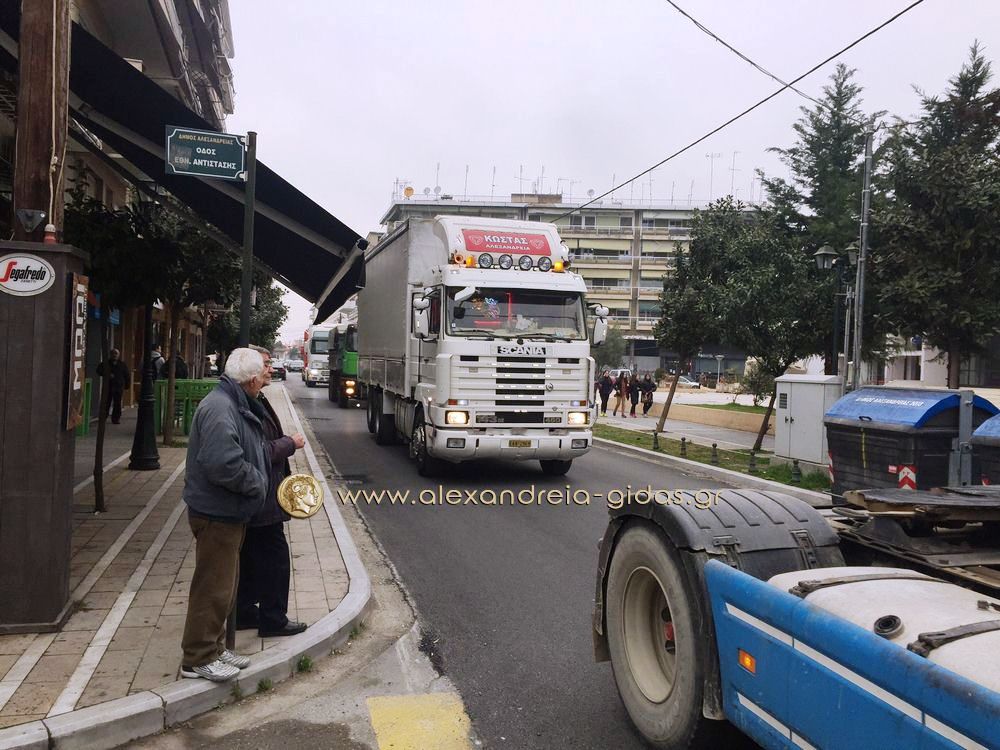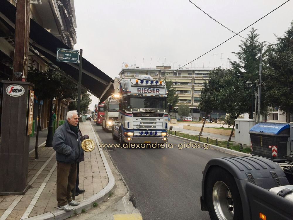Οι οδηγοί ξεκίνησαν με τα φορτηγά τους από το Δημοτικό Στάδιο Αλεξάνδρειας(ρεπορτάζ από το ξεκίνημα στην συνέχεια του Αλεξάνδρεια-Γιδάς), πέρασαν από την Βετσοπούλου και έφτασαν στον μπλόκο των αγροτών στο Νησέλι.