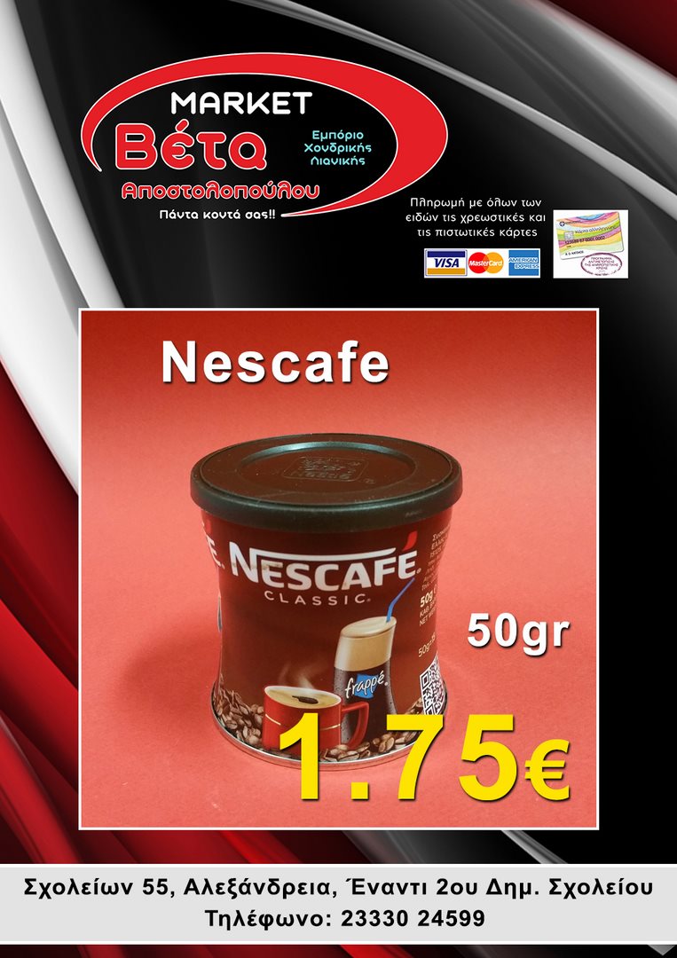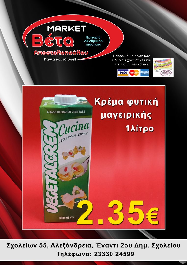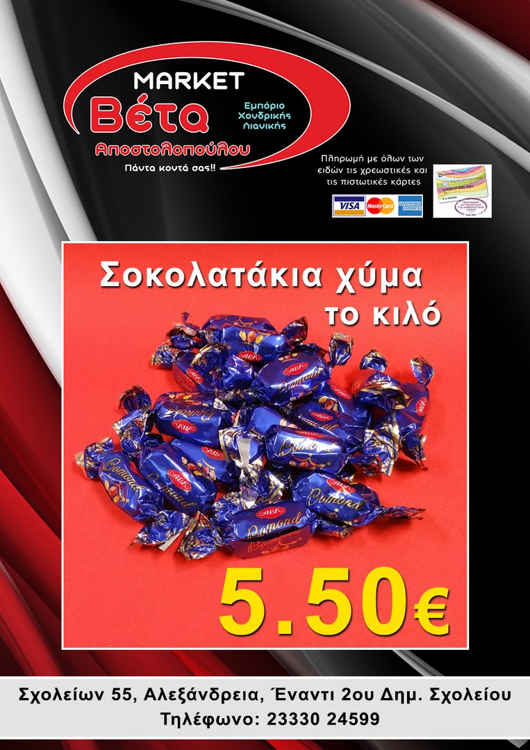 Το μάρκετ ΒΕΤΑ Αποστολοπούλου, βρίσκεται στην οδό Σχολείων 55 στην πόλη μας απέναντι από το 2ο Δημοτικό Σχολείο Αλεξάνδρειας.