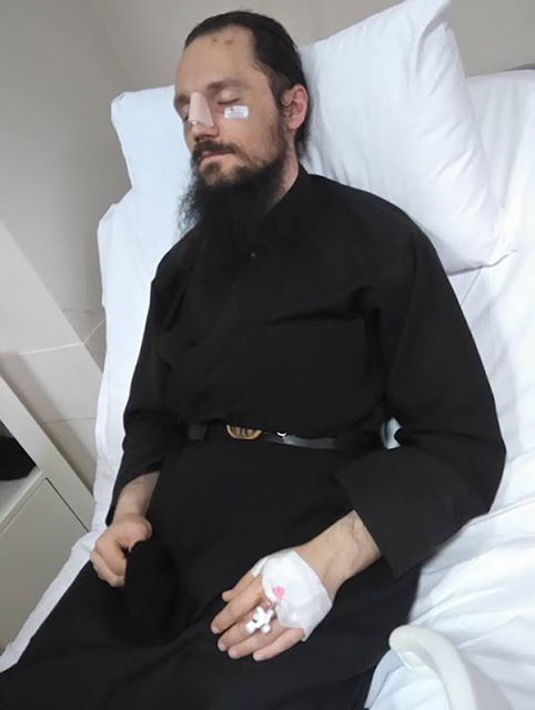 Φωτογραφίες με τον τραυματισμένο, από επίθεση ασθενή με ψυχολογικά προβλήματα, ιερομόναχο – γιατρό π. Αιμιλιανό, που κάνει την ειδικότητά του στο Νοσοκομείο Βέροιας, ανέβασε ο πνευματικός του πατέρας και ηγούμενος της Μονής Τιμίου Προδρόμου – Σκήτη Βέροιας, Αρχιμ. Πορφύριος Μπατσαράς.