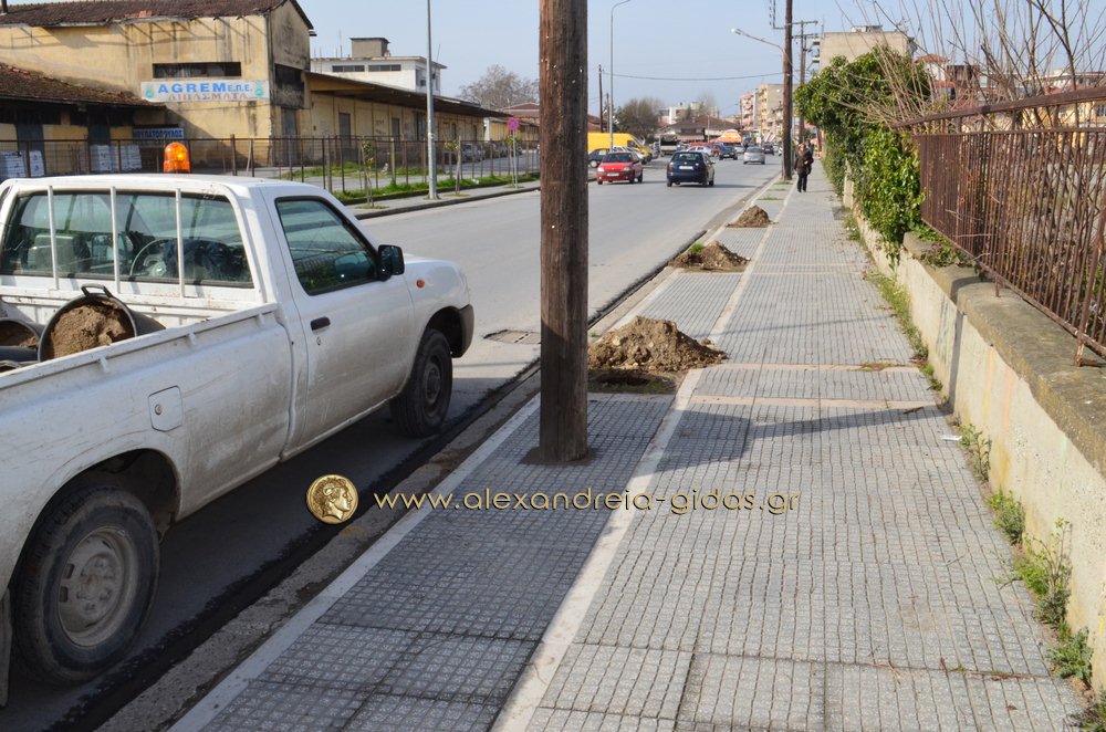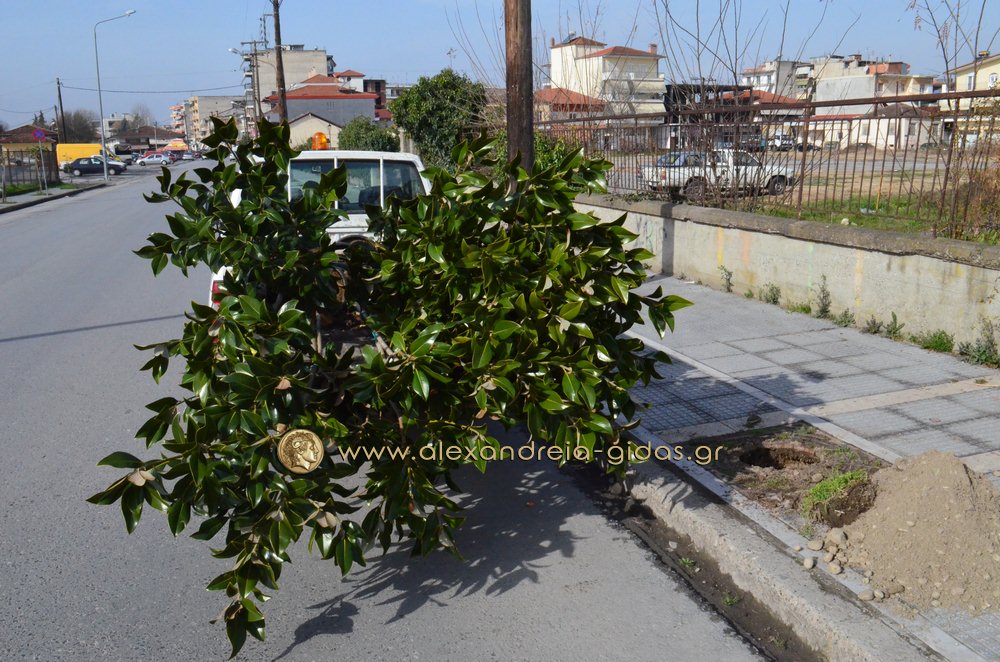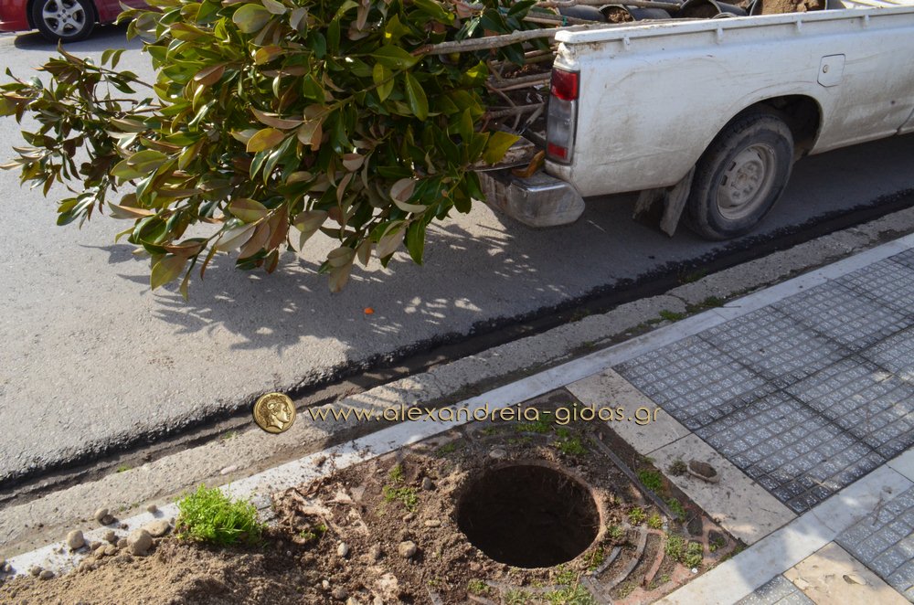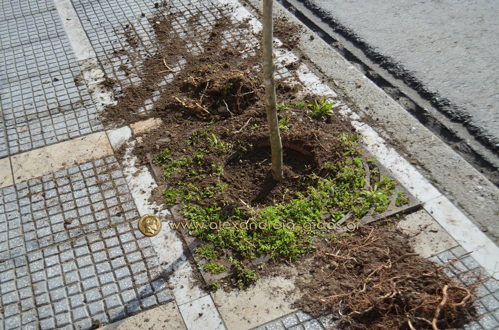 Υπάλληλοι του δήμου Αλεξάνδρειας από το πρωί της Δευτέρας 15 Φεβρουαρίου αντικαθιστούν τα δέντρα που είχαν φυτευτεί με καινούρια.