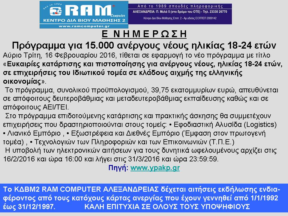 ΕΡΓΑΣΙΑ 15 Φεβρουαρίου, 2016 posted by admin Share Αρχίζει το VOUCHER 18-24: Κάντε την αίτησή σας στη RAM Αλεξάνδρειας! (πληροφορίες) H RAM Computer Αλεξάνδρειας ανακοίνωσε: Αφήστε μια απάντηση Ακύρωση απάντησηςΗ ηλ. διεύθυνση σας δεν δημοσιεύεται. Τα υποχρεωτικά πεδία σημειώνονται με *Σχόλιο * Όνομα Email Ιστότοπος Αποθήκευσε το όνομά μου, email, και τον ιστότοπο μου σε αυτόν τον πλοηγό για την επόμενη φορά που θα σχολιάσω.