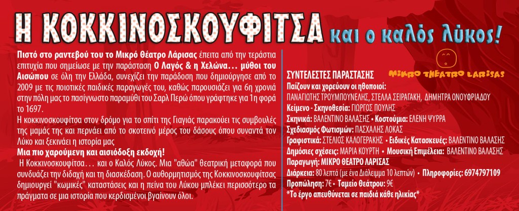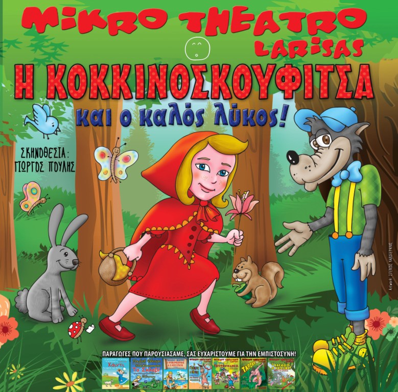 Το Μικρό Θέατρο Λάρισας μετά την μεγάλη επιτυχία της παιδικής παράστασης ”o Λαγός και η Χελώνα…μύθοι του Αισώπου’‘ επιστρέφει στον δήμο Αλεξάνδρειας με την νέα του παραγωγή ”Η Κοκκινοσκουφίτσα και ο καλός λύκος” την Παρασκευή 19/2 ώρες 17.15 & 19.15 στο Δημοτικό Θέατρο, Πλατέος.