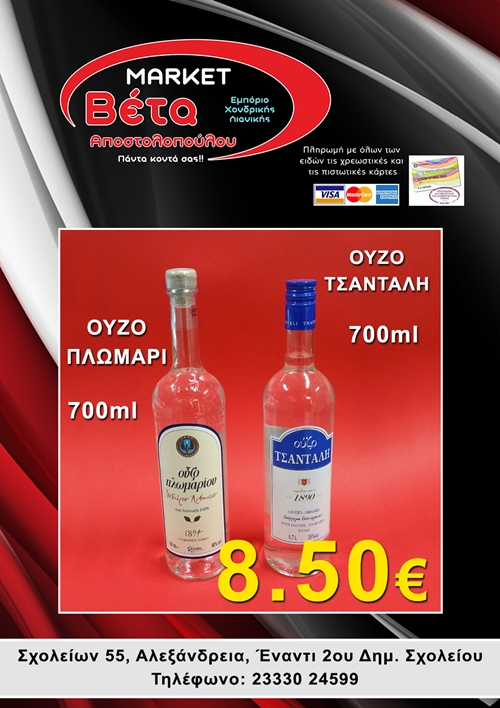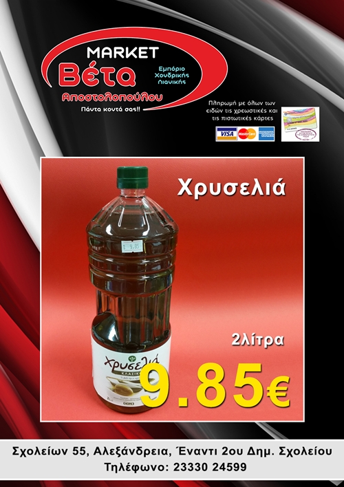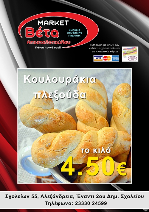 beta1-600x3401-600x340Το μάρκετ ΒΕΤΑ Αποστολοπούλου, βρίσκεται στην οδό Σχολείων 55 στην πόλη μας απέναντι από το 2ο Δημοτικό Σχολείο Αλεξάνδρειας.