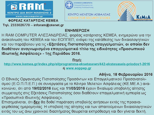 Εξετάσεις Πιστοποίησης επαγγελματιών, οι οποίοι δεν διαθέτουν αναγνωρισμένο επαγγελματικό τίτλο της ειδικότητας «Προσωπικού Ιδιωτικής Ασφάλειας (security)» – 1ης Περιόδου 2016