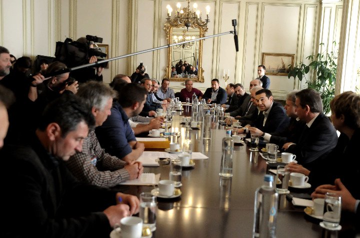 Στη συνάντηση συμμετέχουν ο υπουργός Αγροτικής Ανάπτυξης Βαγγέλης Αποστόλου και ο αναπληρωτής Μάρκος Μπόλαρης, ο υπουργός και ο υφυπουργός Εργασίας Γιώργος Κατρούγκαλος και Αναστάσιος Πετρόπουλος και η κυβερνητική εκπρόσωπος Όλγα Γεροβασίλη.