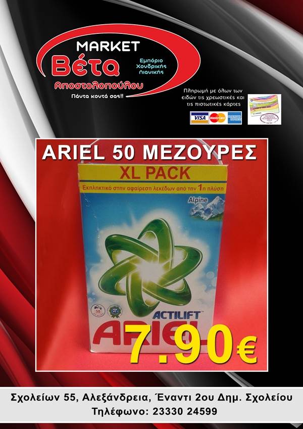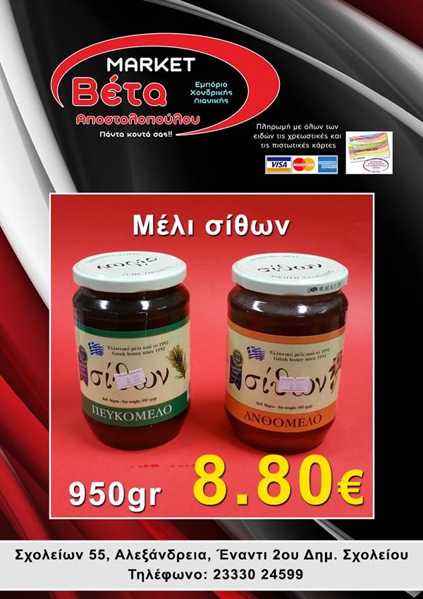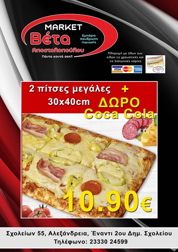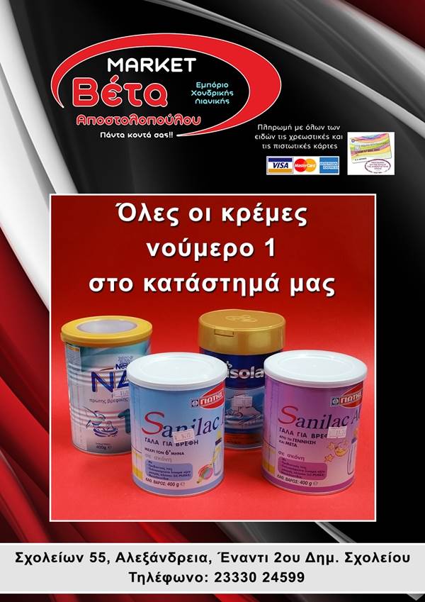 beta1-600x3401-600x340Το μάρκετ ΒΕΤΑ Αποστολοπούλου, βρίσκεται στην οδό Σχολείων 55 στην πόλη μας απέναντι από το 2ο Δημοτικό Σχολείο Αλεξάνδρειας.