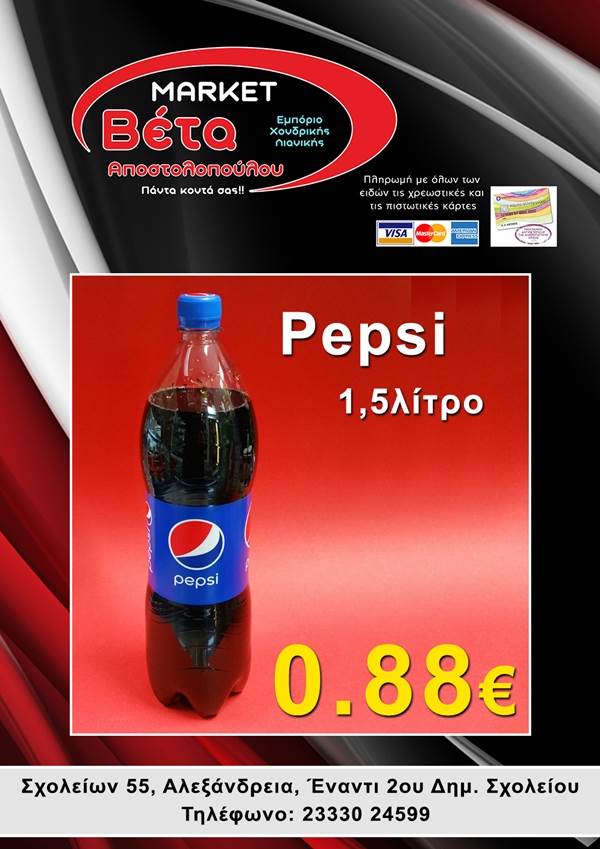 beta1-600x3401-600x340Το μάρκετ ΒΕΤΑ Αποστολοπούλου, βρίσκεται στην οδό Σχολείων 55 στην πόλη μας απέναντι από το 2ο Δημοτικό Σχολείο Αλεξάνδρειας.