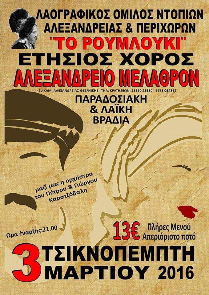 Ο Λαογραφικός Όμιλος Ντόπιων Αλεξανδρείας & Περιχώρων “ΤΟ ΡΟΥΜΛΟΥΚΙ” σας καλεί στον Ετήσιο χορό του που θα πραγματοποιηθεί την Τσικνοπέμπτη 3 Μαρτίου 2016 και ώρα 21:00 στο ΑΛΕΞΑΝΔΡΕΙΟ ΜΕΛΑΘΡΟΝ.