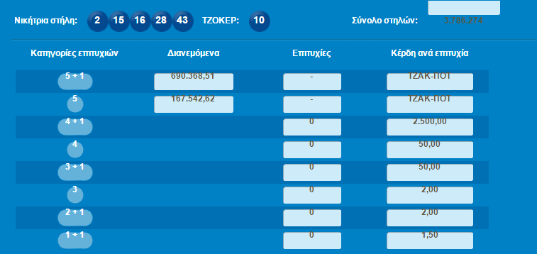 Συνοπτικά οι αριθμοί: 15, 16, 43, 2, 28 και Τζόκερ το 10.