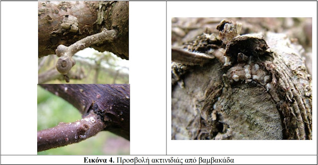 • Το έντομο προσβάλλει και την ακτινιδιά. Συστήνονται εφαρμογές την περίοδο της βλάστησης με θερινά λάδια (Paraffin oil). Να δοθεί ιδιαίτερη προσοχή στην εφαρμογή διότι το έντομο βρίσκεται σε προφυλαγμένες θέσεις (εικόνα 4).