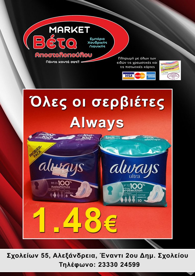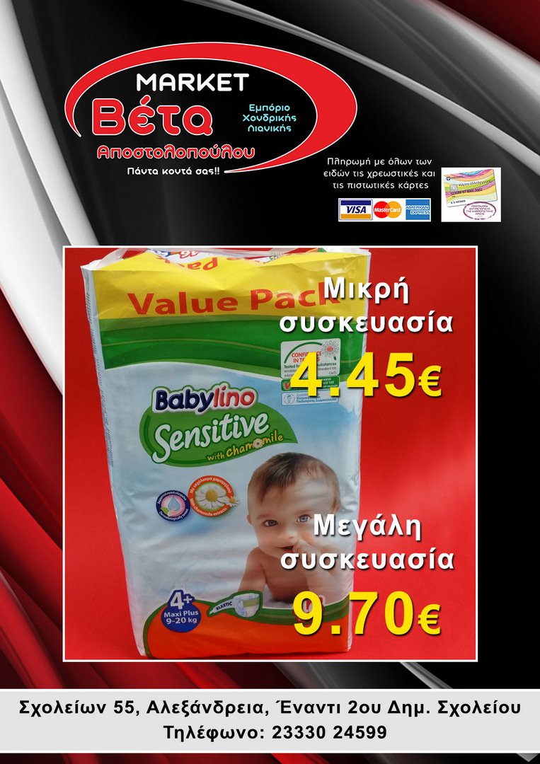 Το μάρκετ ΒΕΤΑ Αποστολοπούλου, βρίσκεται στην οδό Σχολείων 55 στην πόλη μας απέναντι από το 2ο Δημοτικό Σχολείο Αλεξάνδρειας.