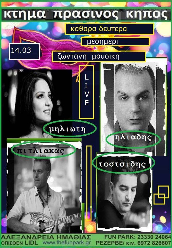 Σήμερα Κυριακή, 13 Μαρτίου ο ΠΡΑΣΙΝΟΣ ΚΗΠΟΣ στην Αλεξάνδρεια είναι ανοιχτός από το μεσημέρι σε όλη τη διάρκεια της ημέρας και ο ΣΕΦ του μαγαζιού σας προσκαλεί να απολαύσετε: