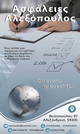 Το πρακτορείο ασφαλειών ΑΛΕΞΟΠΟΥΛΟΥ στην Αλεξάνδρεια ενημερώνει τους ιδιοκτήτες-κατόχους όλων των οχημάτων και των δικύκλων ότι σύντομα θα έρθουν αντιμέτωποι με τσουχτερά πρόστιμα και διοικητικές ποινές σε περίπτωση την οποία, τα οχήματα είναι ανασφάλιστα.