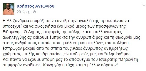 Στην προσωπική του σελίδα στο facebook σχολίασε το θέμα της απόφασης δημιουργίας κέντρου φιλοξενίας προσφύγων στην Αλεξάνδρεια: