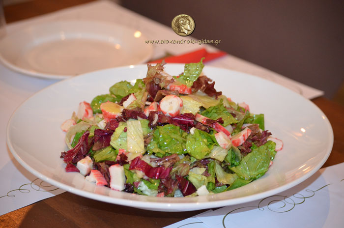 (iceberg, ραντίτσιο, μαρούλι, καβουρόψυχα και αστακοουρά, σως λάδι – λεμόνι, μέλι)