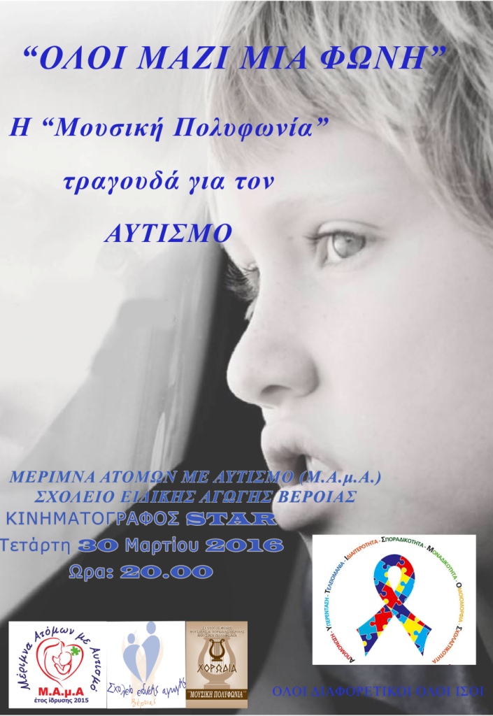 Η Μέριμνα Ατόμων με Αυτισμό (Μ.Α.μ.Α) σας προσκαλεί στη μουσική παράσταση με τίτλο ‘ΟΛΟΙ ΜΑΖΙ ΜΙΑ ΦΩΝΗ’.