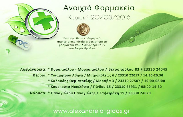 ΤΟΠΙΚΑ 20 Μαρτίου, 2016 posted by admin Share Ανοιχτά φαρμακεία Ημαθίας Κυριακή 20 Μαρτίου Αλεξάνδρεια: Αφήστε μια απάντηση Ακύρωση απάντησηςΗ ηλ. διεύθυνση σας δεν δημοσιεύεται. Τα υποχρεωτικά πεδία σημειώνονται με *Σχόλιο * Όνομα Email Ιστότοπος Αποθήκευσε το όνομά μου, email, και τον ιστότοπο μου σε αυτόν τον πλοηγό για την επόμενη φορά που θα σχολιάσω.