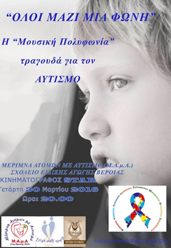 α) Μουσική εκδήλωση που θα πραγματοποιηθεί την Τετάρτη 30 Μαρτίου και ώρα 20:00 στο κινηματογράφο Σταρ, με συνδιοργανωτή το σχολείο Ειδικής Αγωγής Βέροιας. Η «Μουσική Πολυφωνία» θα παρουσιάσουν ένα αφιέρωμα στα ερωτικά του Θεοδωράκη και Χατζηδάκη, ενώ η Ειρήνη Κουρκούλη θα αφιερώσει ειδικά ένα σόλο για το σύλλογο Μ.Α.μ.Α